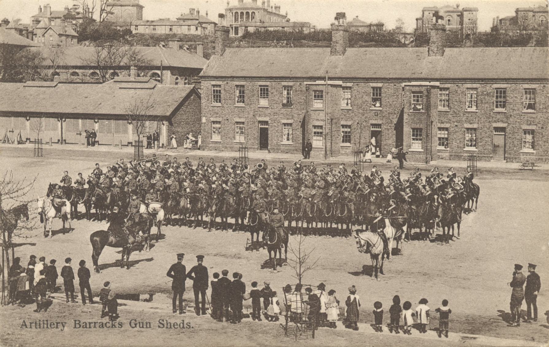 The Waterloo Barracks were either side of Gun Hill, and Burger King is on the site of the guardroom for Waterloo Barracks West. The two barracks were built to a similar pattern and designed for each to accommodate three batteries of artillery, with the Royal Horse Artillery occupying the west barracks and the Royal Field Artillery in the east. On each site were three main buildings to accommodate men and horses, the horses on the ground floor and the men above. To the rear was a large rectangular parade ground, around which were buildings for schools, magazines, gun sheds, a forge, saddle and collar makers workshops, tailors and farriers shops and an officers’ mess.
