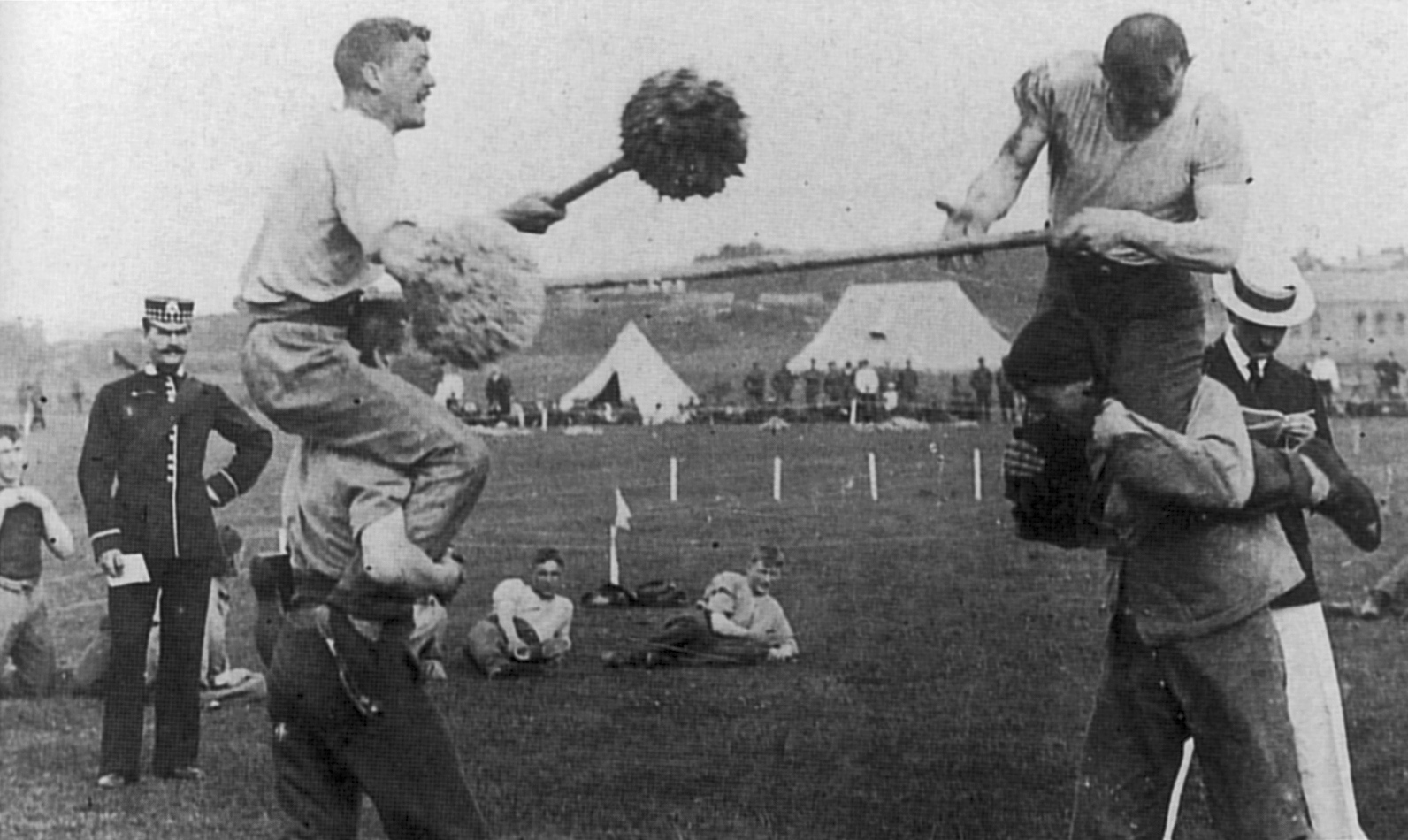 Military bands played in intervals throughout the day, and the public particularly enjoyed some of the more ‘spectacular’ events, such as the ‘Balaclava Mêlée’. This was another cavalry sport, in which two opposing forces were dressed in masks and round helmets, on top of which was a white or red paper plume. On the starting signal the players rode at each other armed with sticks and attempted to knock off the opposing side’s plumes. The team which lost all its plumes first was the loser. The Navy and Army Illustrated reported that the mêlées “provide the spectators with several minutes’ genuine amusement”. For the infantry there was a similar game, but the “riders” were on the shoulders of their comrades and armed with mops covered with either flour or soot: “This procedure produces a series of studies in black and white which are hailed with general laughter.”