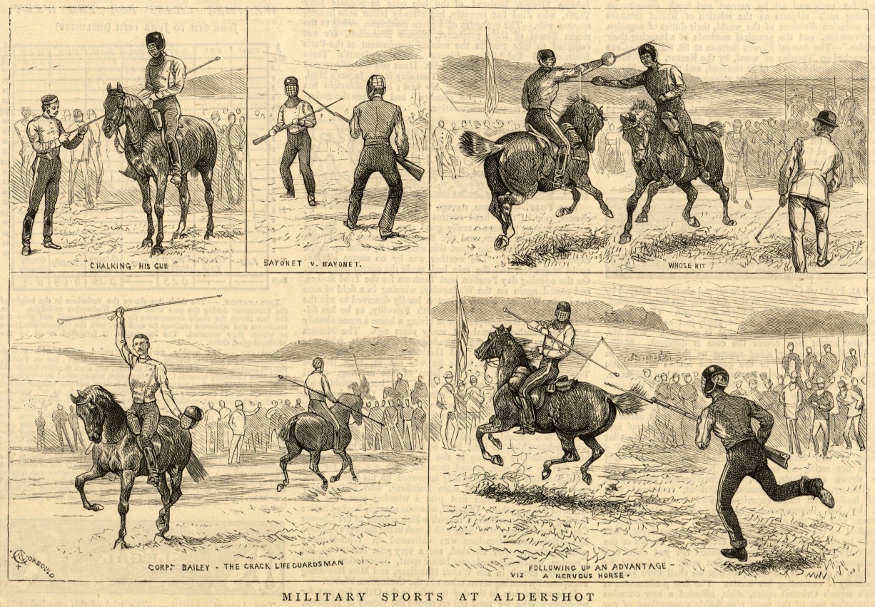 The now familiar combat sports were regular fixtures, including sword versus bayonet, sword versus lance, bayonet versus bayonet, lance versus bayonet, etc, plus the ever-popular tug of war, tent-pegging and lemon-cutting. To these were added the cavalry sports of ‘Cutting at Turks’ Heads’, in which dummy “heads” were placed on uprights to the right and left of a rider who galloped down between them cutting at each as he passed, and ‘Tilting at the Ring’, which was similar except that instead of “heads” there were rings suspended from hooks, which the rider attempted to carry off with the point of his sword.