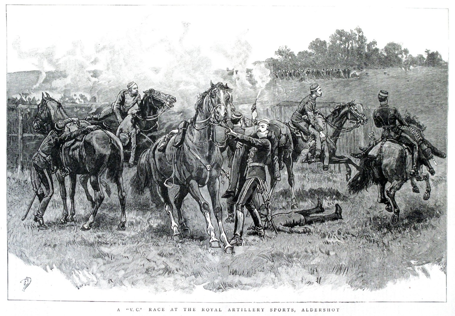 An event open to any mounted troops was ‘The Victoria Cross Race’. This had originated in India and was first run in Britain in 1885, when the Royal Artillery in Aldershot included it in their Sports Day, and it soon became a popular event in the Military Tournament. In the race several riders attempted to pick up their “fallen comrades”, represented by stuffed dummies, and return with their “comrade” to the start. They had to negotiate various obstacles and jumps on the way to the dummy and on the ride back, and throughout the “enemy” fired blank ammunition in an attempt to distract men and horses, and to make the whole event more entertaining for the crowd. As the Aldershot Military Gazette reported in 1902: “The greater the excitement and the greater the risk, the greater too is the appreciation of the onlookers”.