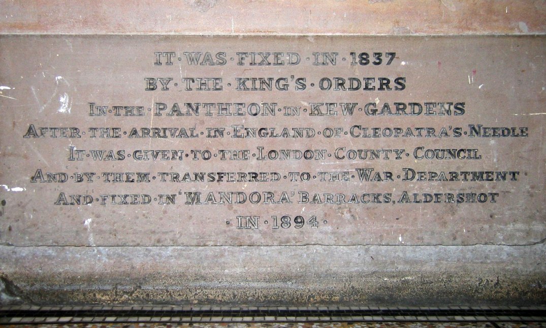 In early 1891, the Director of Kew Gardens wrote to the Chairman of London County Council offering him the stone tablets recording Abercromby’s victories. He apparently believed that it would be appropriate to have them with the obelisk as they had been originally being set into the pedestal in Egypt. The Chairman accepted, believing that it was just a small tablet, but when the size of the stones were seen the Council decided that they could not be fixed to the new pedestal. Unsure of what to do with them, the tablets were temporarily housed with the United Services Institution.