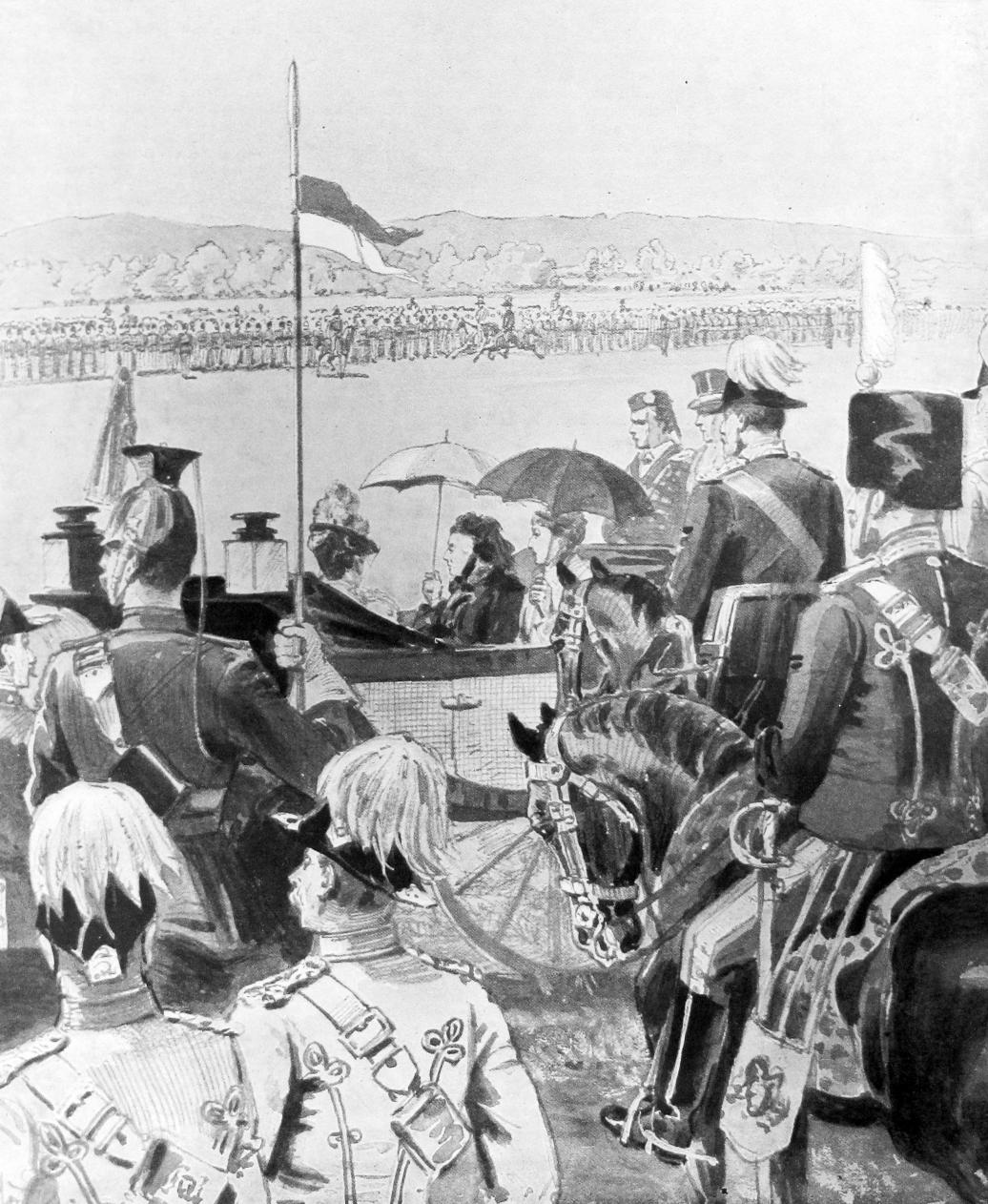 Ten years later, the Queen’s Diamond Jubilee Review was held at Aldershot on 1 July 1897. This was somewhat smaller than the 1887 event, with 27,000 troops on parade, but it was remarkable for the assembly of members of the extended royal family. Accompanying the Queen were the Prince and Princess of Wales, the Duke and Duchess of York, Princess Victoria of Wales, Prince and Princess Charles of Demark, the Empress Frederick of Prussia, the Duke and Duchess of Connaught, Prince Henry of Battenberg, the Duchess of Albany, Princess Aribert of Hainault, Princess Victoria of Schleswig-Holstein, and the Duke of Cambridge. Also present were representatives from all over the British Empire and from nearly every state in Europe.