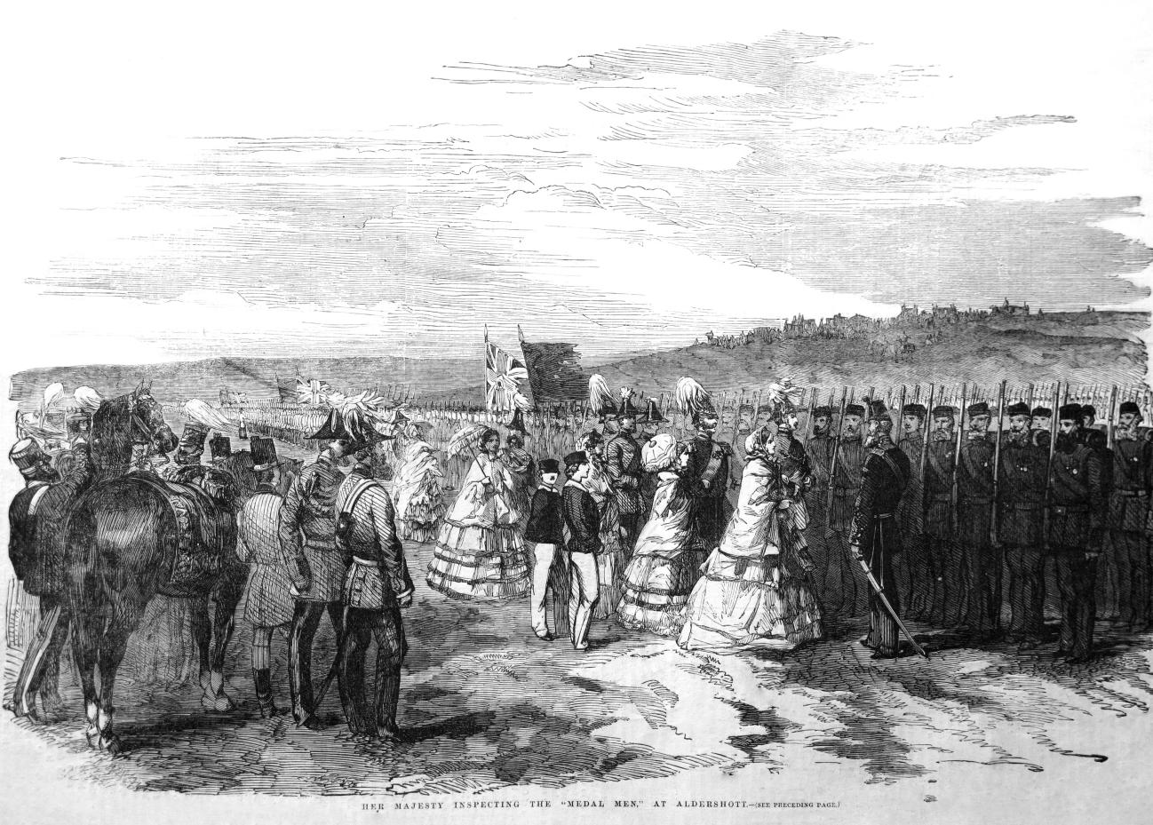 A few months later, on 7 July 1856, the Queen was back in Aldershot, this time accompanied by the Prince Consort, the Prince of Wales, the King of the Belgians, Prince Oscar of Sweden, the Comte de Flanders, the Duke of Cambridge, and Lord Panmure, the Secretary of State for War. The purpose of this visit was to inspect the Brigade of Guards and to honour the soldiers who had recently returned from the Crimean War. On 8 July a grand field day was organised in the valley below Hungry Hill, during which the Crimean regiments formed three sides of a square around the royal carriage to hear the address from the Queen. Her Majesty declared that she had “mourned with deep sorrow for the brave men who have fallen in their country’s cause, and that I have felt proud of their valour which, with their gallant allies, they have displayed on every field.” The day was a great success, only spoilt by the heavy rain which fell for most of the time, although, as a contemporary account noted, “it was a small matter to [the soldiers] after the hardships of the Crimea”. In a letter to the Duke of Cambridge, the Queen wrote that “we had a charming field day ... which I enjoyed more than any I ever saw, and was on horseback for four hours amongst the troops ... Altogether we spent a most agreeable time at Aldershot.”