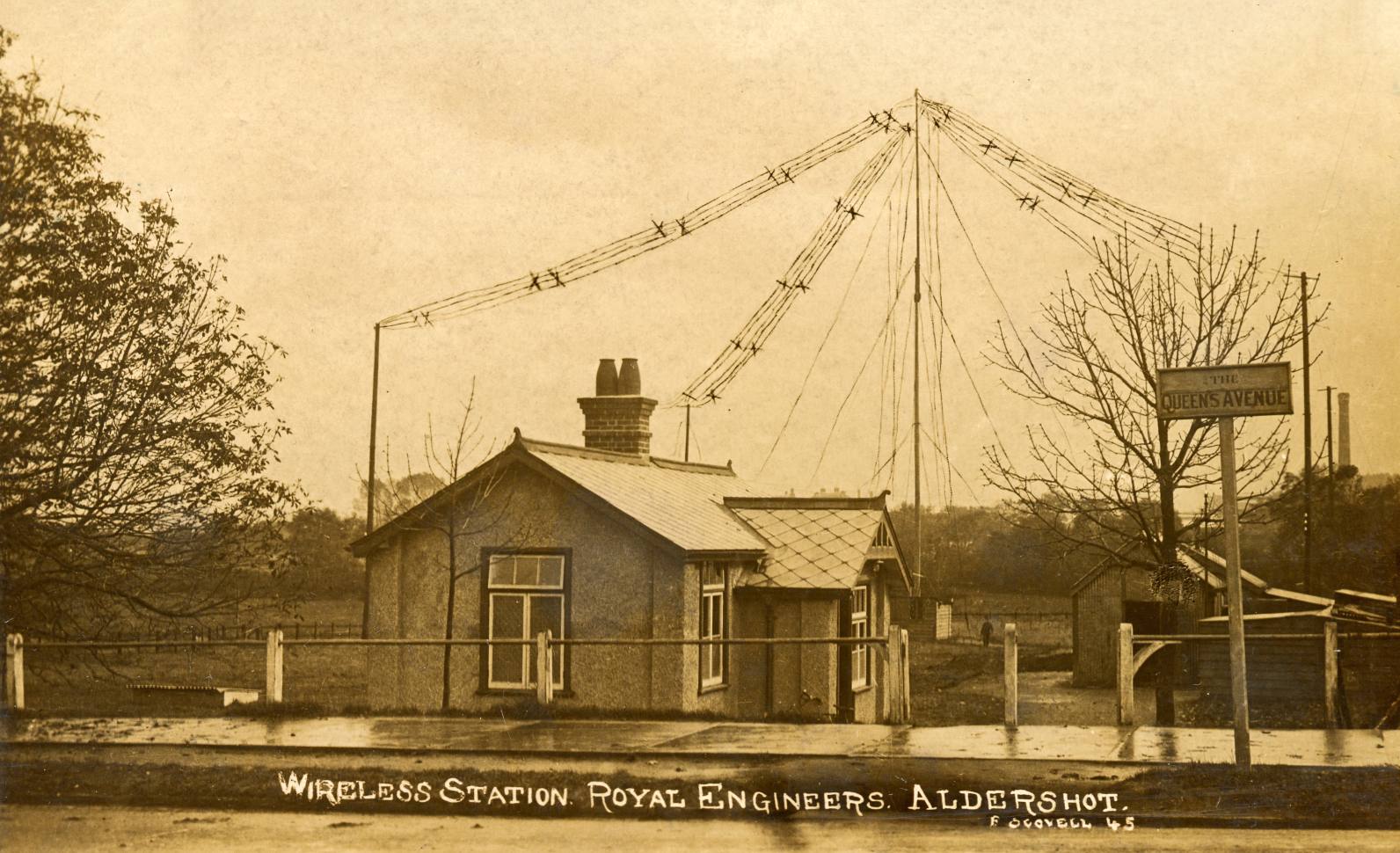 A significant technical innovation in the decade before the First World War was the increasing use of wireless communications. Aldershot had been an important site in wireless experimentation since 1899 when Marconi had made the first use of wireless in aviation by sending signals between two balloons. A wireless station was built by the Royal Engineers, on the site which is now the car park on the corner of Queen’s Avenue and Prince’s Avenue.