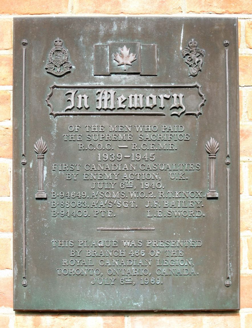 The three Canadians who died, QMS Knox, Staff Sergeant Bailey and Private Sword, of the Royal Canadian Ordnance Corps, were the first Canadian soldiers to die on service overseas from enemy action. In addition, a civilian NAAFI manager was killed and a further 29 men were injured. In 1969 the Royal Canadian Legion of Toronto presented a memorial plaque for the Canadian soldiers who died, which was mounted on the old Aldershot Command Headquarters building in Steele’s Road. The plaque was moved to the new Montgomery House HQ building in North Camp, and re-dedicated when the building was opened in 2014.