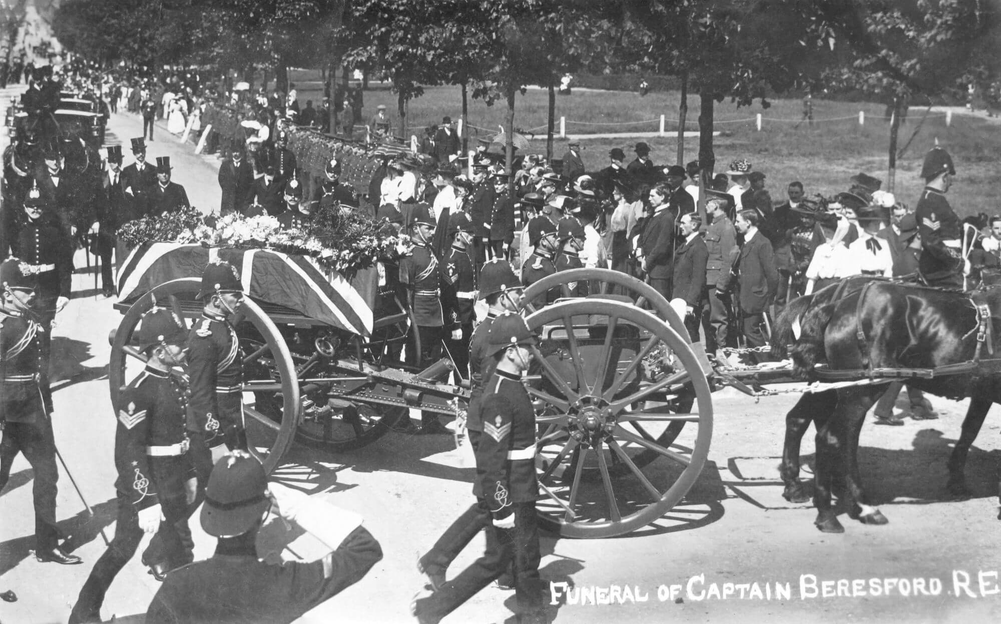 After the service the coffin was taken to the military cemetery. The impressive procession was led by the bands of the 3rd Dragoon Guards and the Royal Artillery. The coffin was borne on a gun carriage, followed by the principal mourners on foot and in carriages. After this group came the senior military officers and representatives of all units in Aldershot, while crowds lined the route. At the cemetery NCOs of the Royal Engineers carried the coffin to the grave, where men of Beresford’s troop fired the salute. Over a hundred wreaths were laid on the grave, from officers, men and units from all parts of the garrison.
