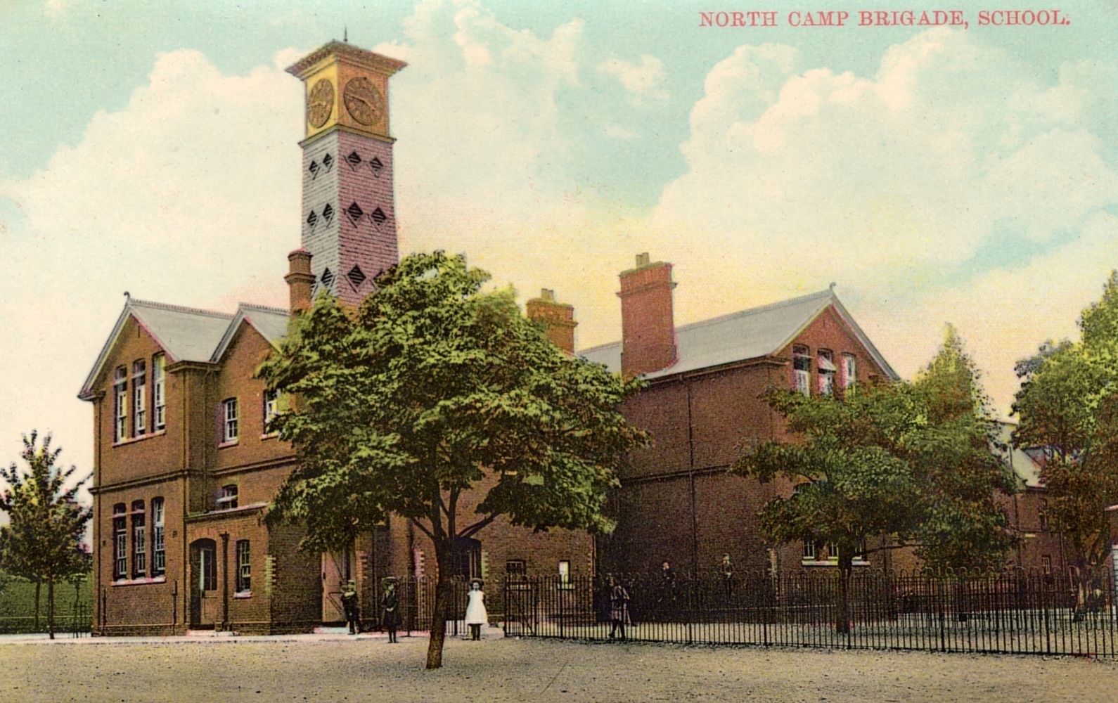 There had been Army schools in the camp since the earliest days, when they were housed in large wooden huts, each school shared by two battalions. These were adult and elder children’s schools; for younger children there were divisional infants’ schools in North and South Camps, and in the Permanent Barracks. Sheldrake’s 1859 ‘Guide to Aldershot’ described the “large central Garrison Infant School for 120 children, and quarters for four school-mistresses, a covered playground, an open playground inclosed by a wall, and a small garden for instruction”. Soldiers were expected to send their children to the Army schools, and after 1870 attendance was made compulsory. Nominal fees had to be paid, two pence per month for one child of an NCO or soldier, with reductions for additional children of the same family.