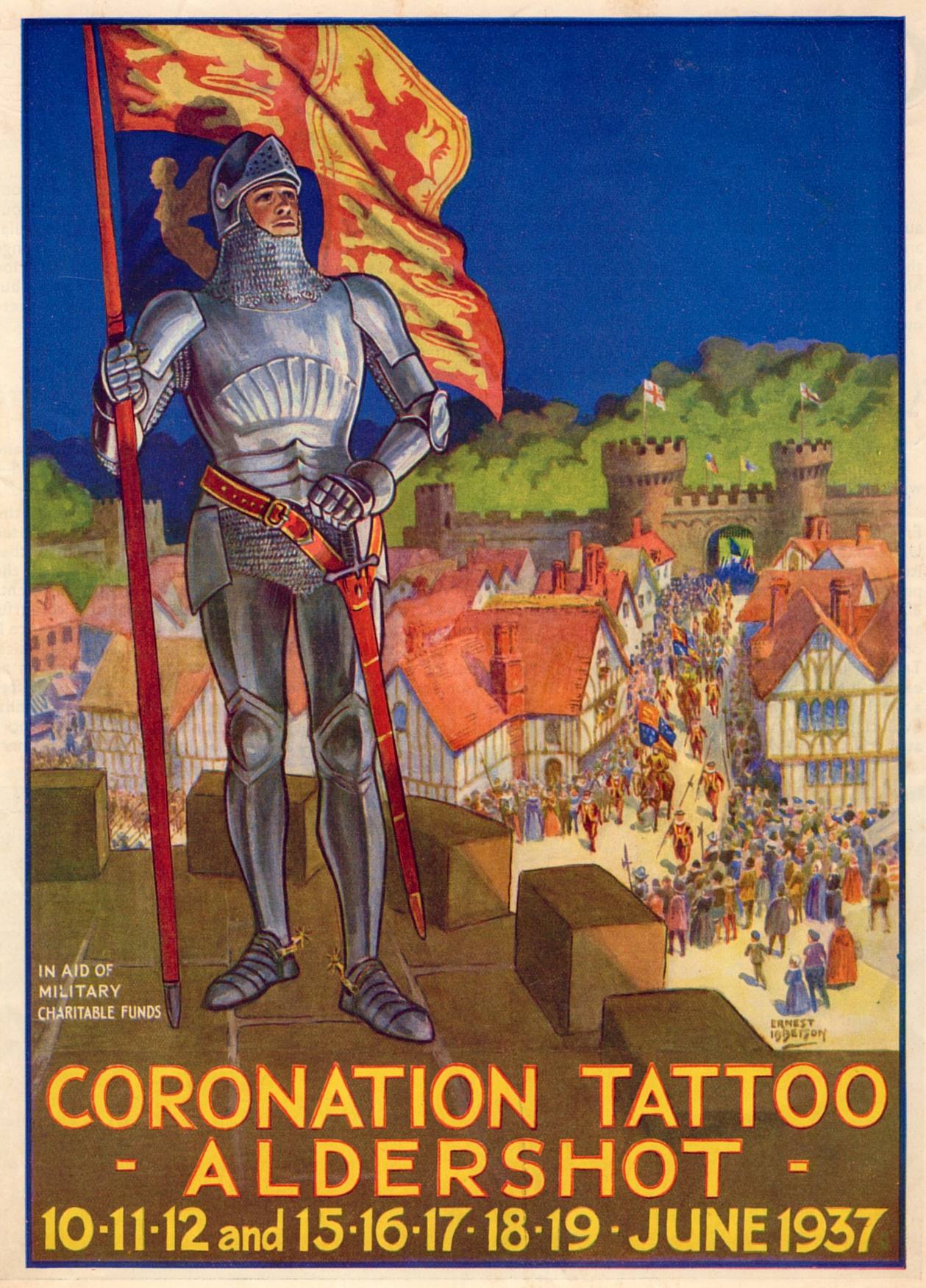 In Aldershot the main focus for celebrations was the Coronation Tattoo, held over eight days from 10 to 12 and 15 to 19 June. The Searchlight Tattoos had been revived after the First World War and grew in size each year, from 1923 held in the specially constructed Rushmoor Arena. The theme of the Coronation Tattoo was “Loyalty to the Crown”, and the programme consisted of musical performances, a demonstration of a modern battle action, and large spectacular historical re-enactments. Taking part in the arena were troops drawn from seven cavalry regiments, five artillery brigades, twenty-seven infantry battalions, and all the technical and support corps. Taking part in the massed bands displays were four mounted bands (three cavalry and one Royal Artillery), twenty infantry bands, eight drum and fife bands, four corps of bugles, and eight pipe bands. The grand finale included a parade of the banners and bodyguards of all monarchs from William the Conqueror to the Hanoverians and an appearance by “the King’s Champion” in full armour, who formally challenged anyone who doubted the king’s right to reign.